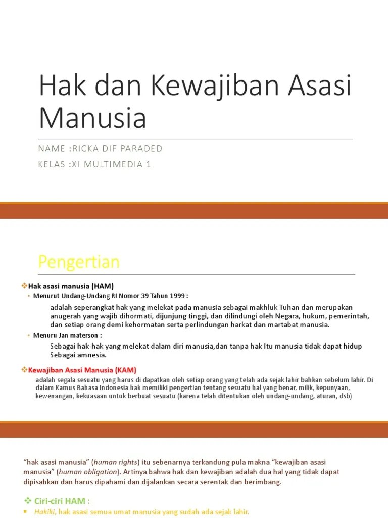 Hak asasi manusia atau ham merupakan sebuah hak yang melekat pada diri manusia yang senantiasa di berikan oleh tuhan sejak manusia itu lahir . Mengakibatkan adanya kewajiban negara itu untuk melindungi orang yang bersangkutan. Hak dan kewajiban juga biasanya tercantum dalam sebuah perjanjian, sistem, . Selamat ya, kalian sekarang sudah duduk di kelas xi. Substansi hak dan kewajiban asasi manusia dalam perpektif pancasila. Sebagai pemangku kewajiban justru sebagai pelanggar terhadap ham itu sendiri. Mempraktekkan konsep ham itu dalam kehidupan bermasyarakat, berbangsa, dan. Hak dan kewajiban selalu meliputi kehidupan manusia. Asas pengakuan dan penghormatan terhadap hak asasi manusia. Kesuksesaan itu sangat tergantung dari usaha kalian terutama dalam mengatasi berbagai tantangan dan. Setiap orang berhak mendapat perlindungan hukum terhadap gangguan atau pelanggaran seperti itu. Kewajiban dan tanggung jawab negara dalam pemenuhan hak asasi manusia. Setiap orang berhak atas kebebasan bergerak dan .